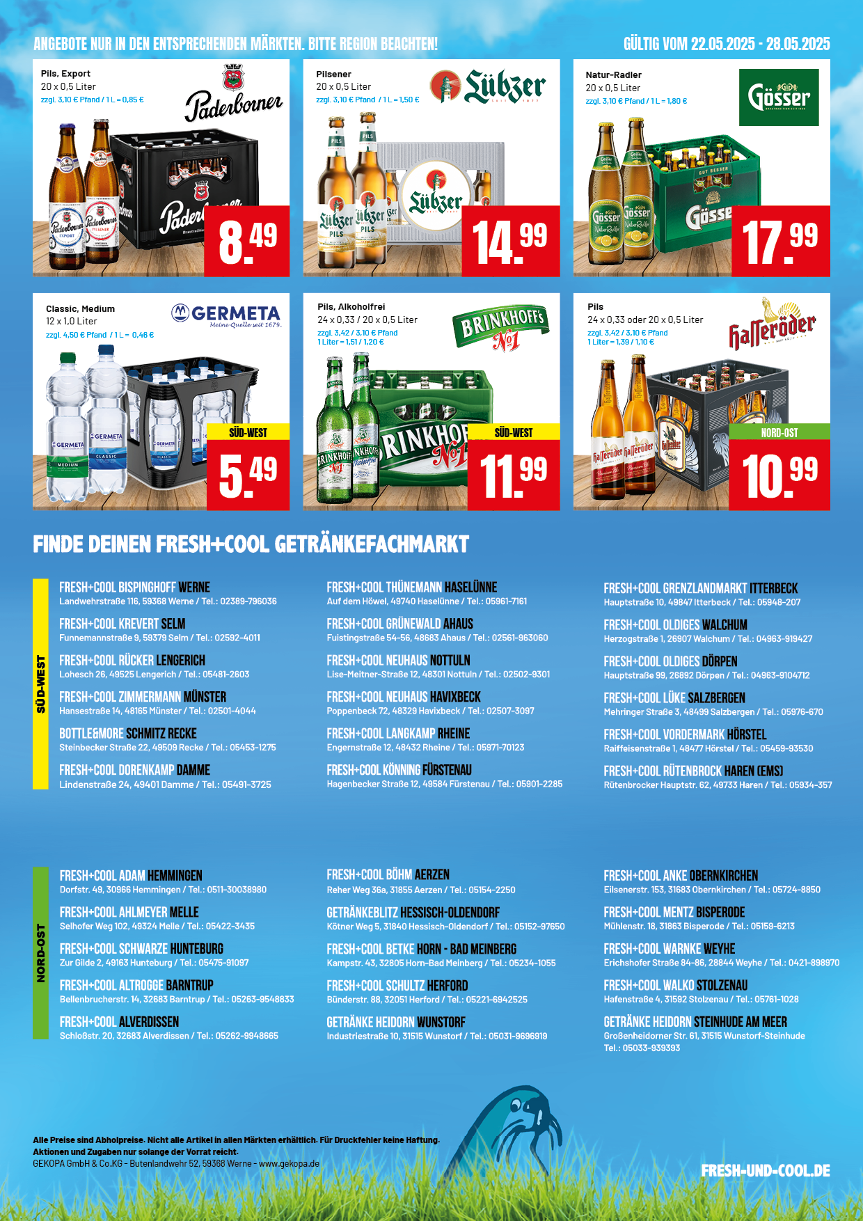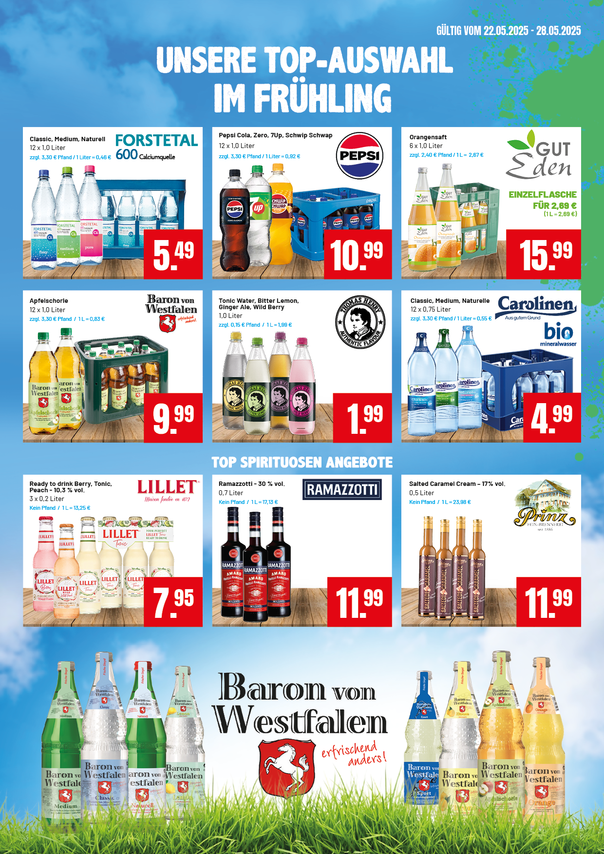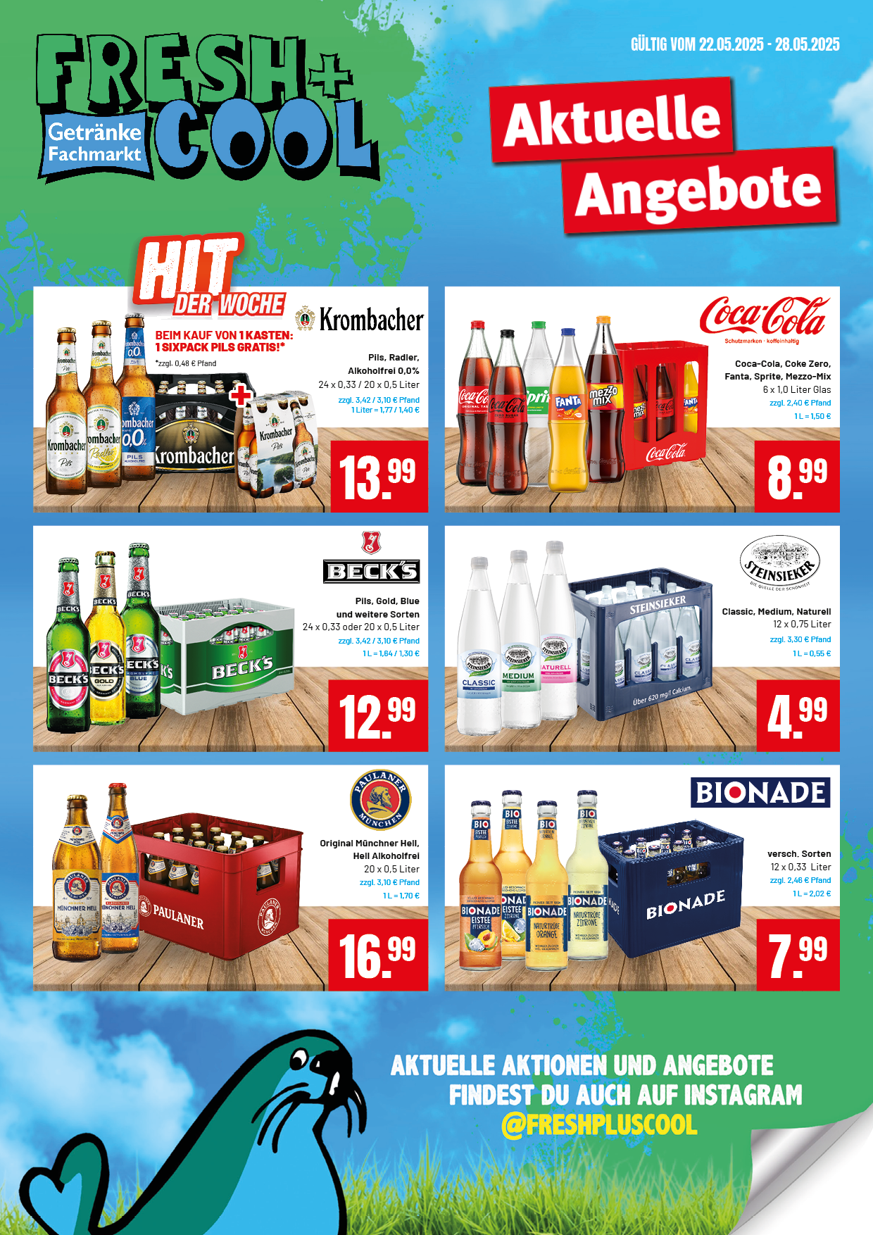 Die Woche gibt es bei 1 Kiste Krombacher 1 Sixpack Pils dazu. Außerdem haben wir Gösser Naturradler und Baron von Westfalen Apfelschorle im Angebot.